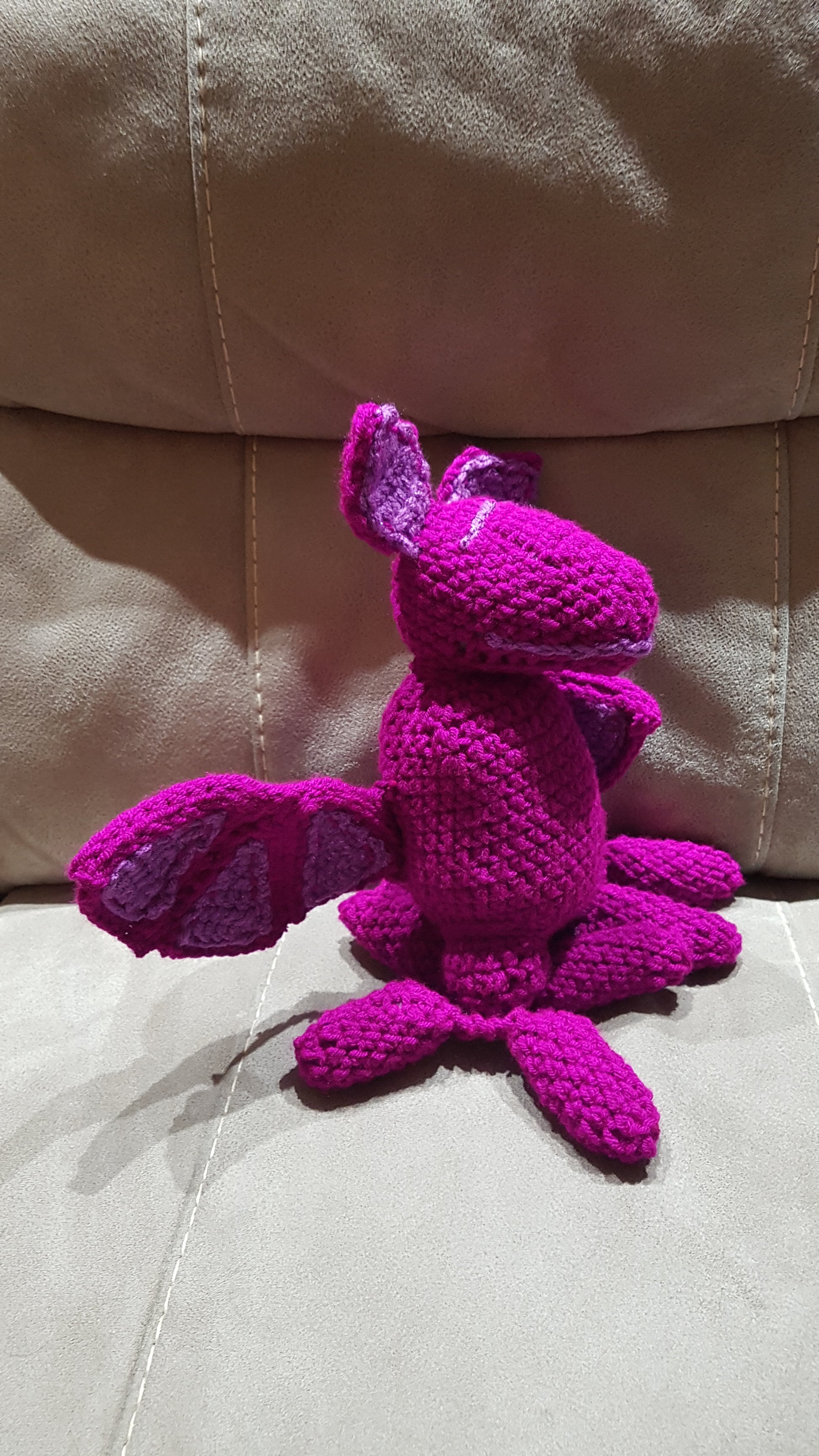 Crocheted in pink yarn with sparkly purple details. A spooky friend who wants to "hang" out with you!