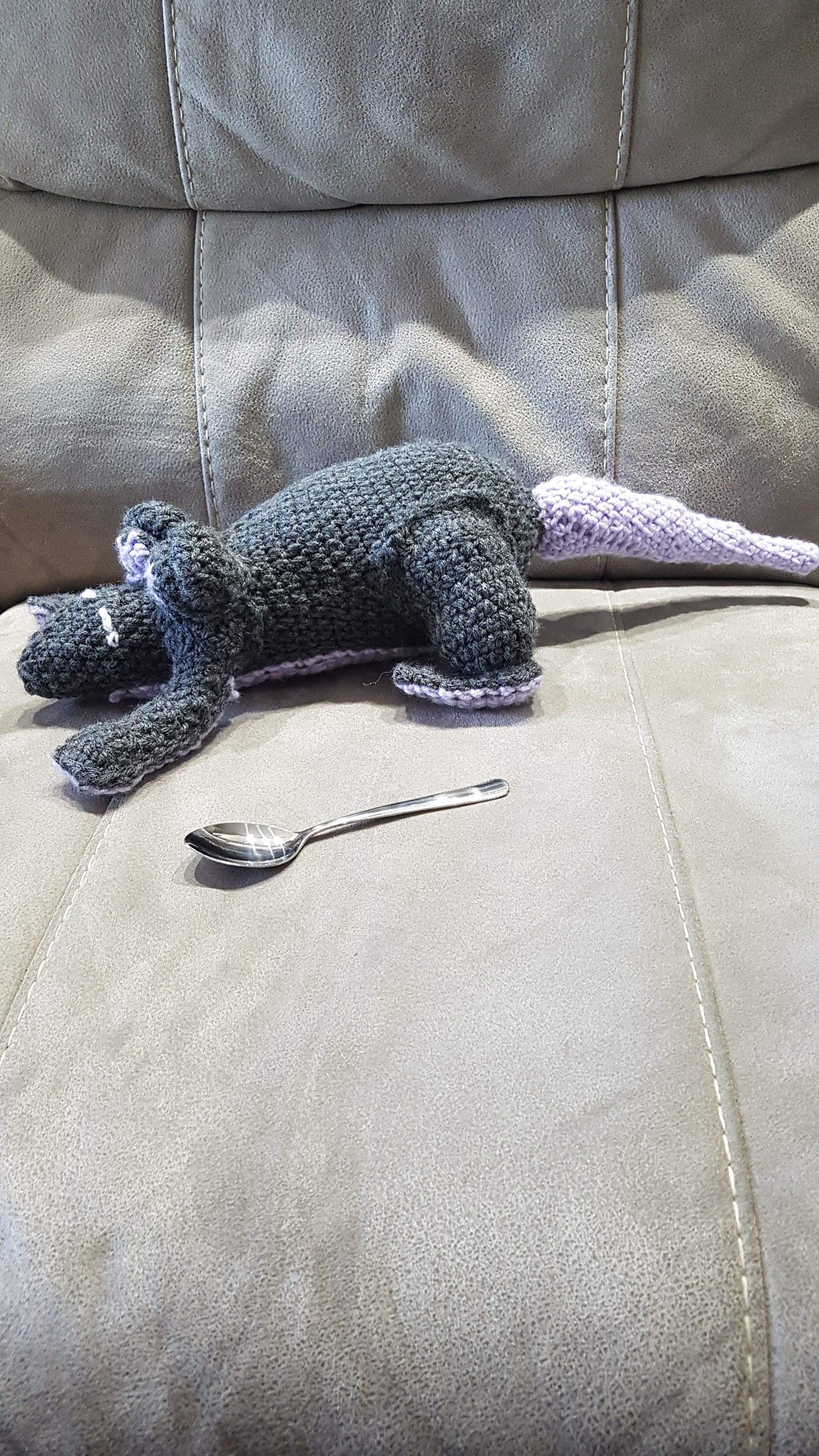 Crocheted with soft yarn in grey with purple and white details. A curious friend waiting to meet you.