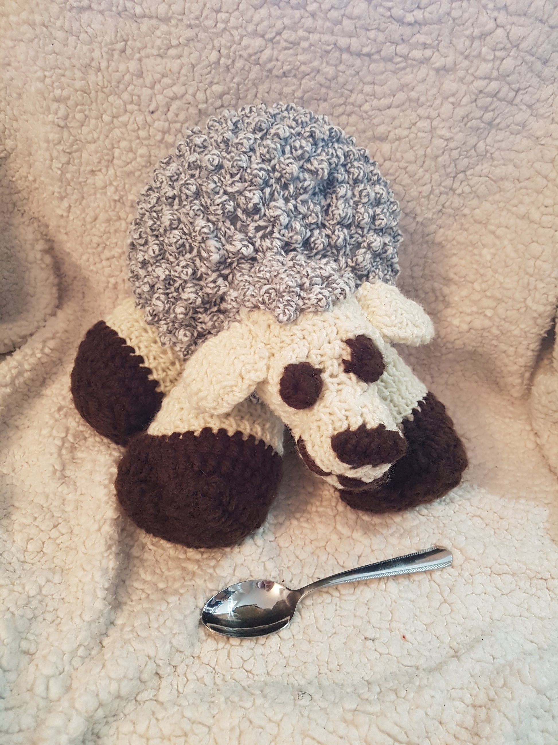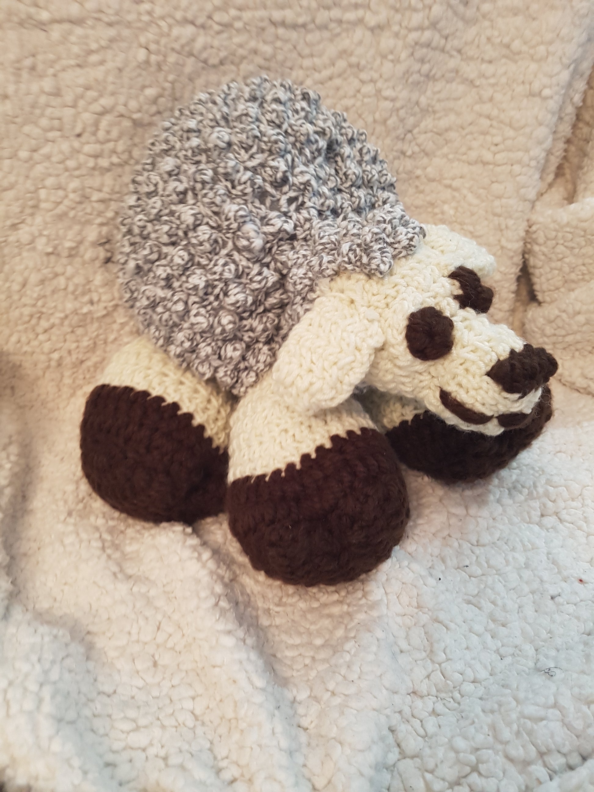 13" long sheep, alternating white and grey 'wool' with cream and brown details. A cuddly buddy.